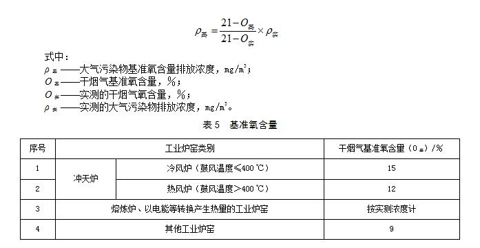 實測的工業(yè)爐窯排氣筒中大氣污染物排放濃度,應按以下公式換算為基準氧含量下的排放濃度,并以此濃度作為判定排放是否達標的依據(jù)。各類工業(yè)爐窯的基準氧含量按表5的規(guī)定執(zhí)行。