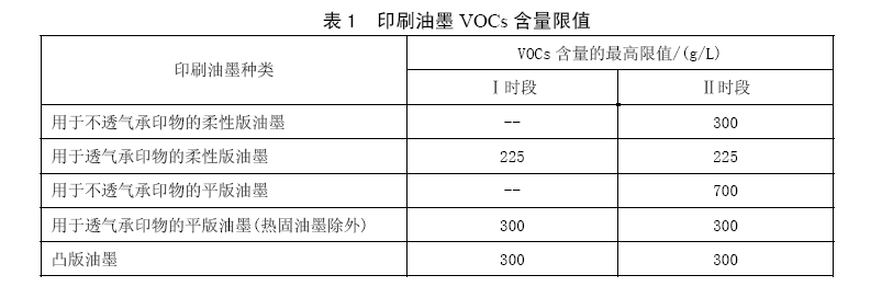 印刷企業(yè)生產(chǎn)過(guò)程中使用的印刷油墨VOCs含量限值(為處于即用狀態(tài)以每升油墨所含多少克VOCs計(jì)算)應(yīng)執(zhí)行表1的規(guī)定。