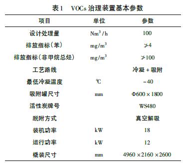 老罐區(qū)苯罐采用江蘇金門能源裝備有限公司設(shè)計、制造的JM - VRECS - CD/AD - 100 型VOCs 治理裝置,冷凝+ 吸附集成工藝,裝置主要參數(shù)如表1。