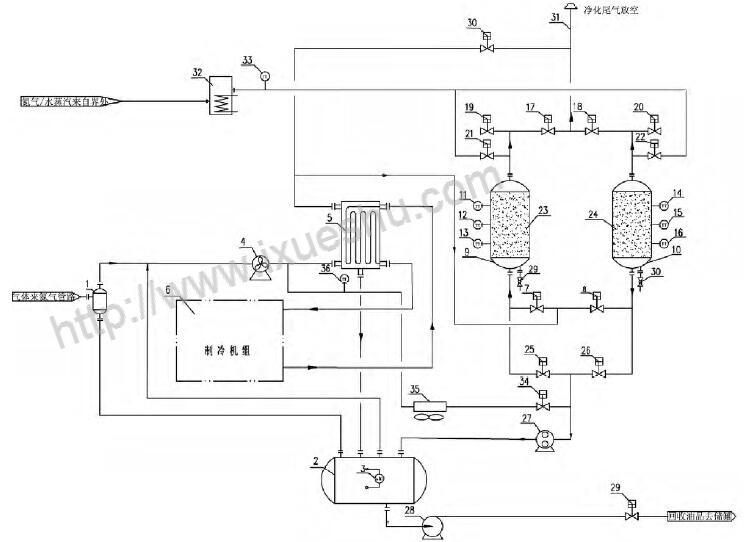 1 - 凝液收集罐; 2 - 氣液分離罐; 3 - 液位變送器; 4 - 風(fēng)機; 5 - 冷箱; 6 - 制冷機組; 7 - 吸附罐進(jìn)口閥A; 8 - 吸附罐進(jìn)口閥B; 9 - 吸附罐A; 10 - 吸附罐B; 11 - 溫度變送器A; 12 - 溫度變送器B; 13 - 溫度變送器C; 14 - 溫度變送器D; 15 - 溫度變送器E; 16 - 溫度變送器F; 17 - 吸附罐出口閥A; 18- 吸附罐出口閥B; 19 - 吸附罐破真空閥A; 20 - 吸附罐破真空閥B; 21 - 吹掃氣進(jìn)口閥A; 22 - 吹掃氣進(jìn)口閥B; 23 - 吸附劑床層A; 24 - 吸附劑床層B; 25 - 真空脫附閥A; 26 - 真空脫附閥B; 27 - 真空泵; 28 - 回液泵; 29 - 外輸液流量開關(guān)閥; 30 - 緊急放空閥; 31 - 排放筒; 32 - 加熱器; 33 - 熱氣體溫度變送器; 34 - 熱氣體脫附開關(guān)閥; 35 - 冷卻器、36 - 冷卻溫度變送器