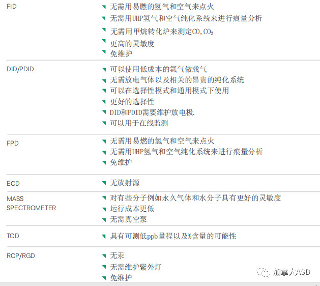 增強等離子體放電技術可以代替許多形式的檢測器,詳見下表